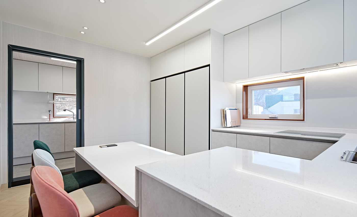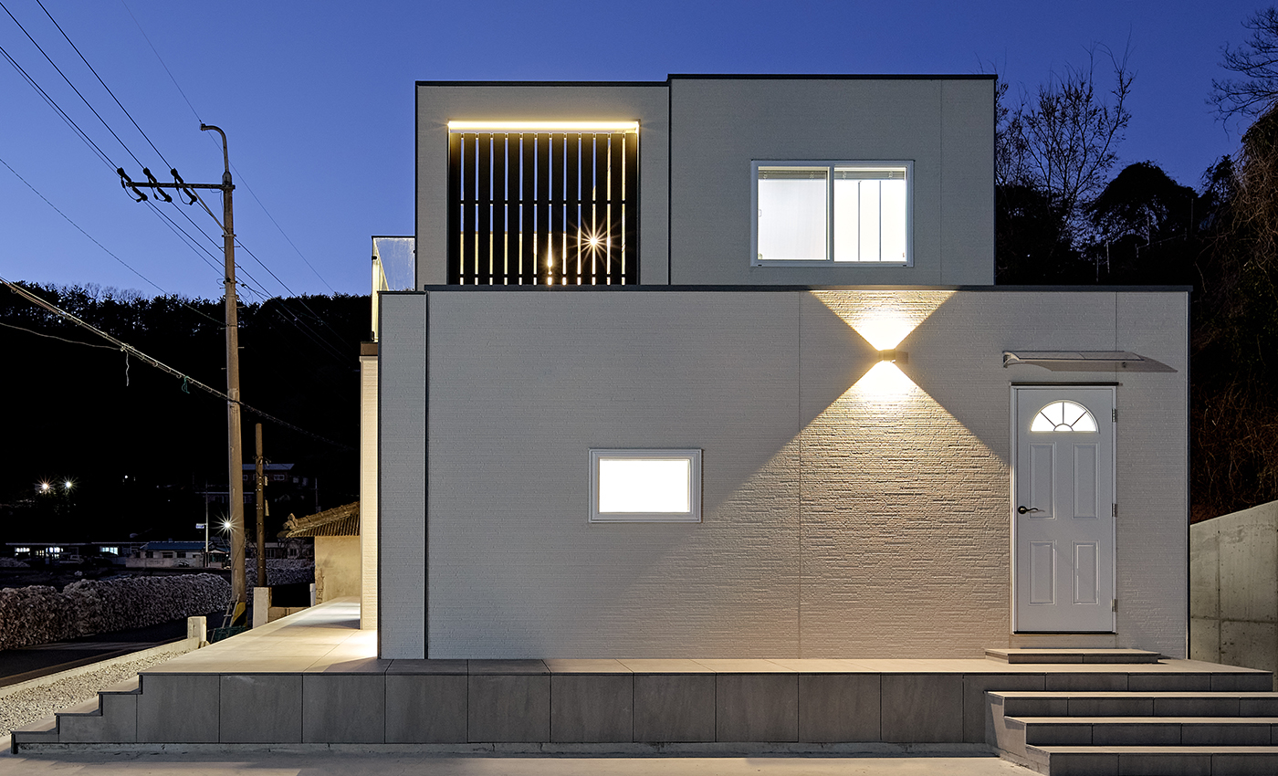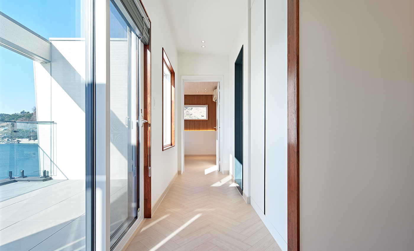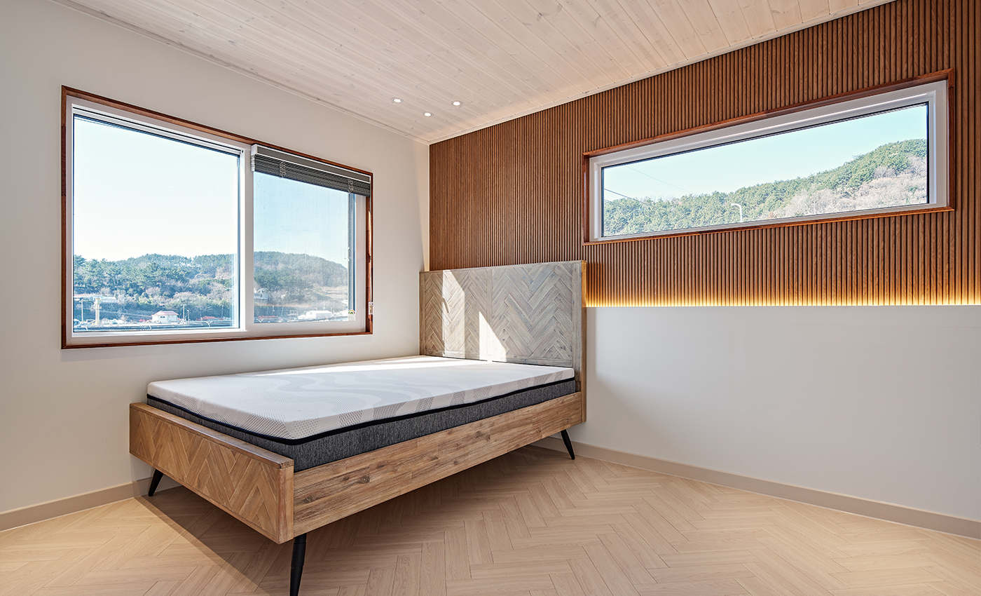 현대적인 모던하우스 스타일의 이동식모듈러 주택입니다. 넉넉하고 편리한 다용도실과 수납공간을 확보한 생활공간을 갖추고 있으며 전면의 창호는 밝고 확트인 채광과 전망을 보장합니다. 테라스는 기존 데크의 문제점을 개선한 내구성과 고급스러운 세라믹데크로 이루어져 유지보수에 용이합니다.