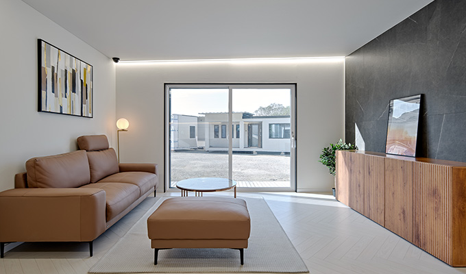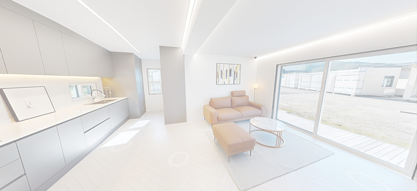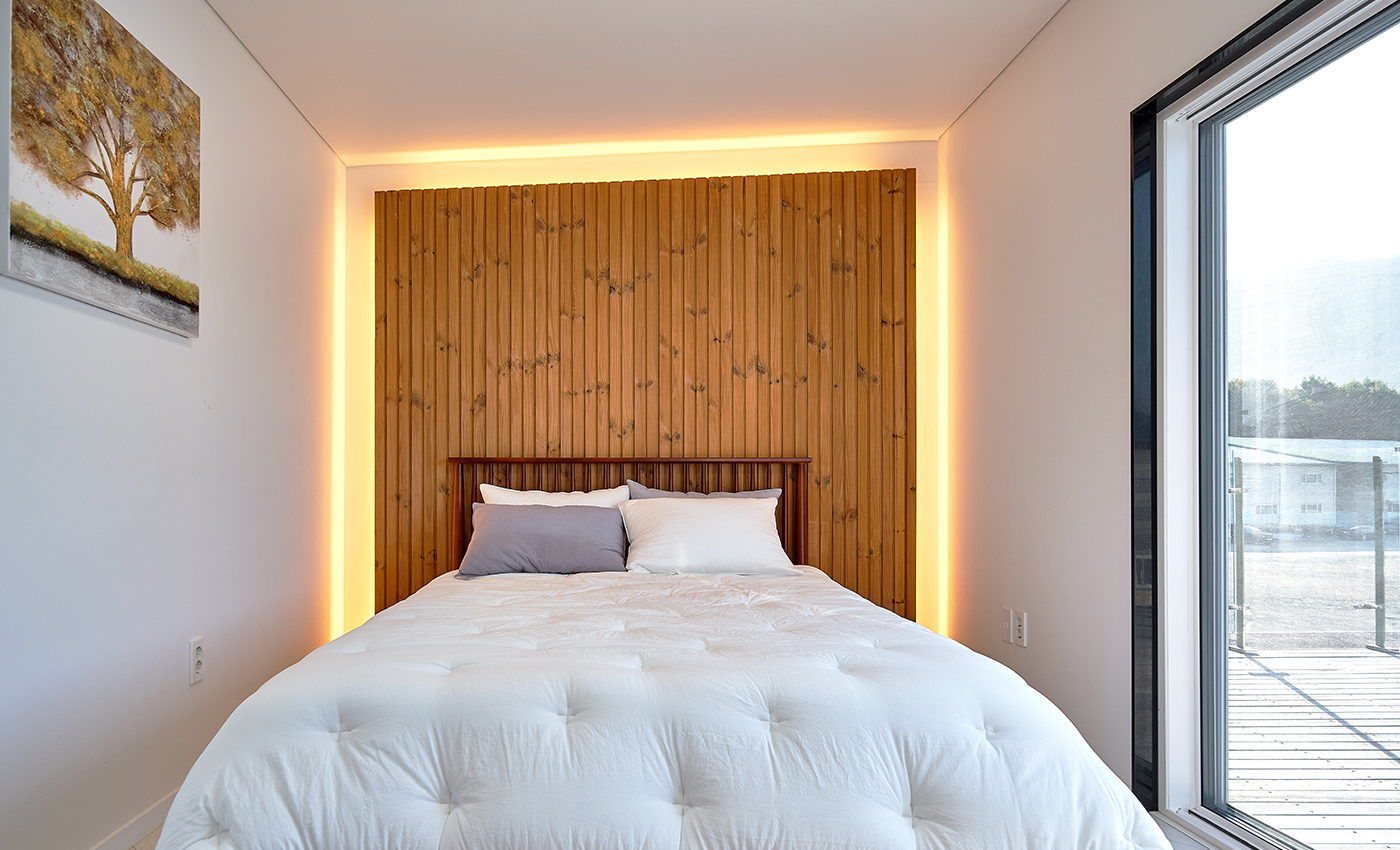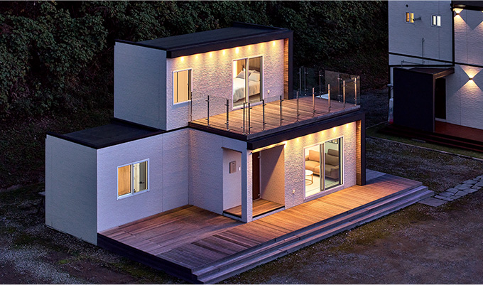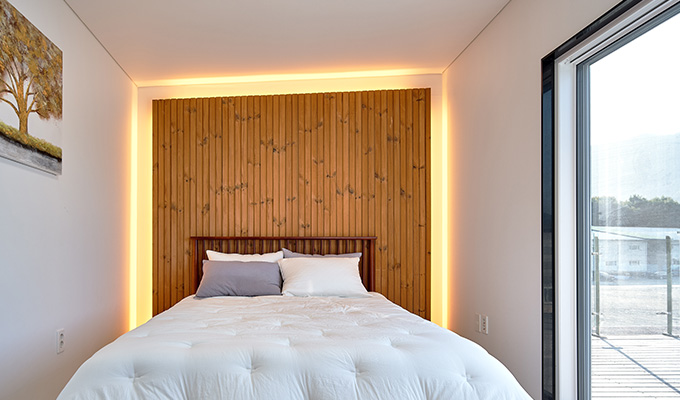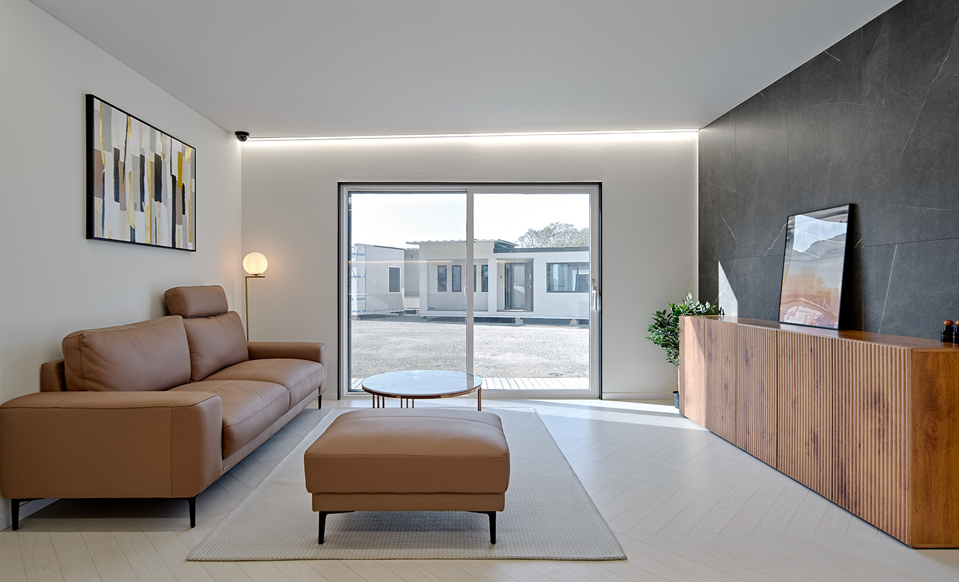 이동식 모듈러 경량목구조. 외장재(세라믹사이딩 슬림스톤)는 자연스런 패턴으로 마감하였고 내부는 라인조명으로 간접효과를 주어 은은하고 아늑한 분위기와 넓어 보이도록 연출하였습니다.