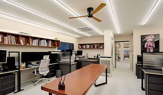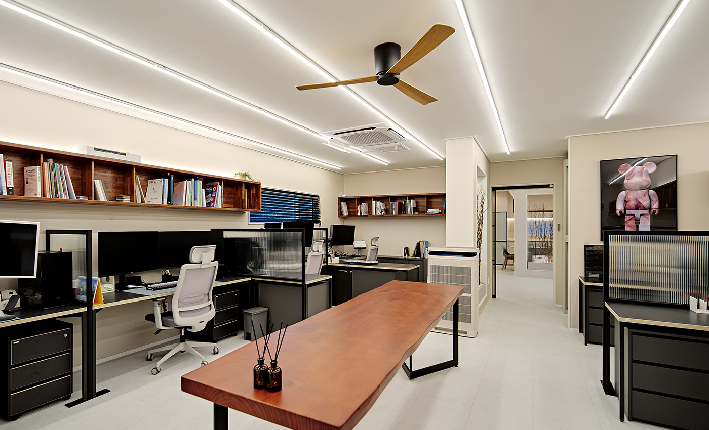 이동식 모듈러 경량목구조. 사무동건물(근린생활시설)로 사용하지만 주택용으로도 변경 가능한 모듈러 주택입니다. 라인조명으로 건물 외관 형태와 롱브릭 마감재가 돋보이게 연출했으며 내부마감재가 벽지와 타일이 아닌 웰패널(콜렉트월,웰스톤)로 내구성과 유지보수관리에 용이합니다.